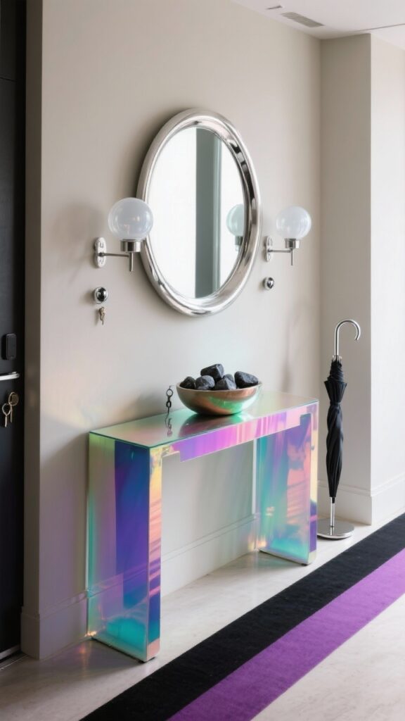 Your foyer becomes a high‑style checkpoint between worlds. Paint the walls a soft greige, then introduce a holographic console table that shifts colors as you walk by. Above it, install a rounded mirror with a satin nickel frame.
