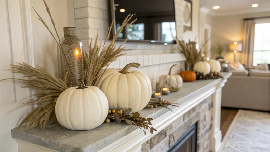 - Key Elements: Real pumpkins, corn husks, berry garlands, brass accents, fall leaves mantel arrangements.